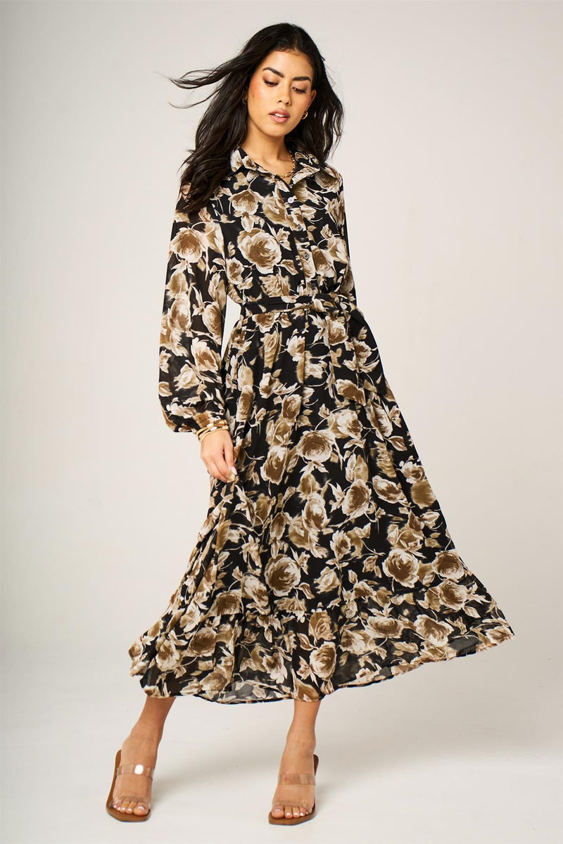 FS Collection Black Floral Print Shirt Midi Dress With Tie Waist