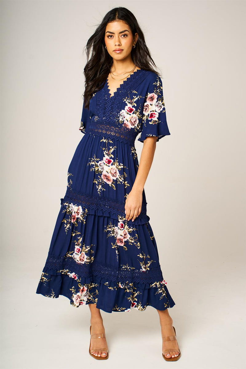Lace & Beads Melody Blue Floral Frill Maxi Dress
