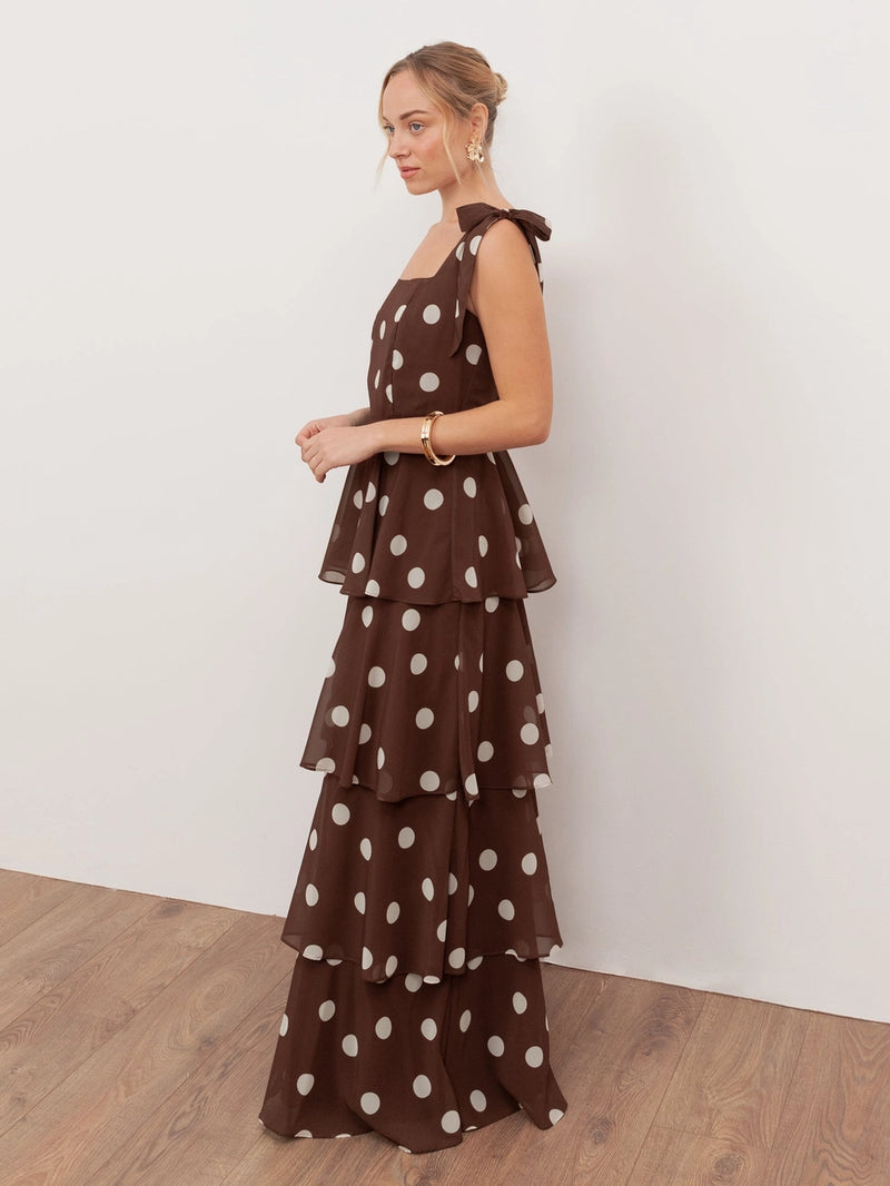 Anaya With Love Brown Polka Dot Tie Shoulder Tiered Maxi Dress