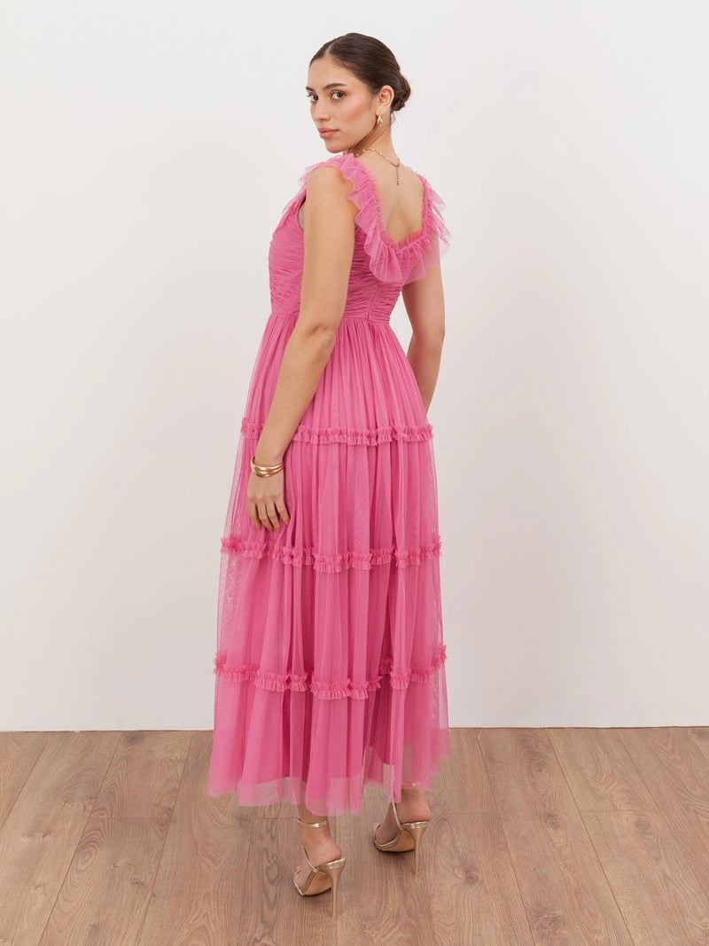 Anaya With Love Pink Ruffle Square Neck Tulle Midaxi Dress
