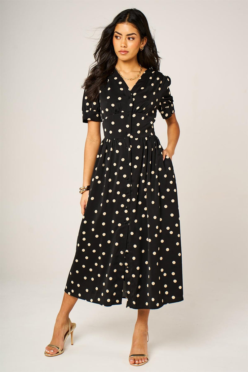 Girl In Mind Drew Puff Sleeve Berry Dot Midi Dress