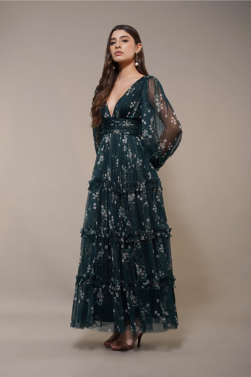 Lace & Beads Lydia Emerald Green Floral Tulle Maxi Dress
