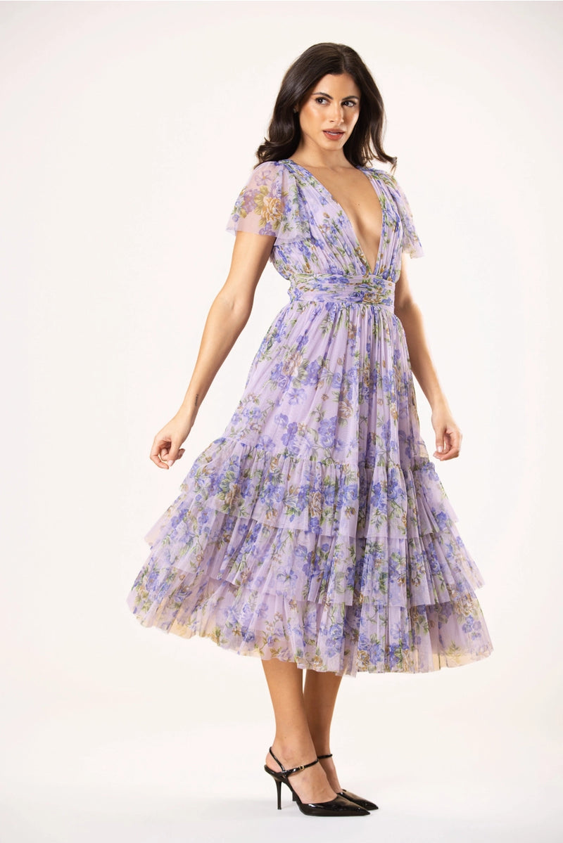 Lace & Beads Madison Lilac Floral Tulle Midi Dress