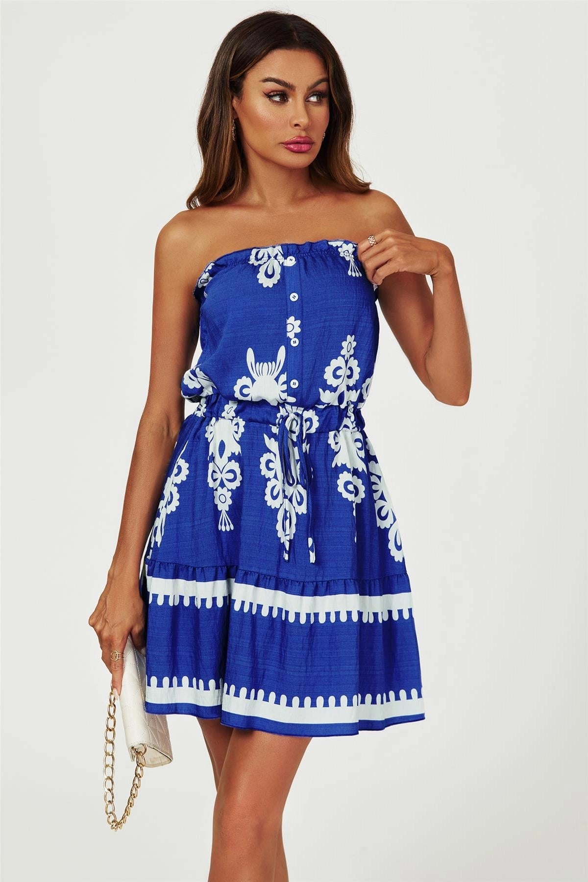 This breezy and charming dress features a vibrant floral print and delicate broderie detailing, perfect for sun-soaked days. The strapless bandeau design ensures a flattering and comfortable fit, while the mini length adds a playful touch.