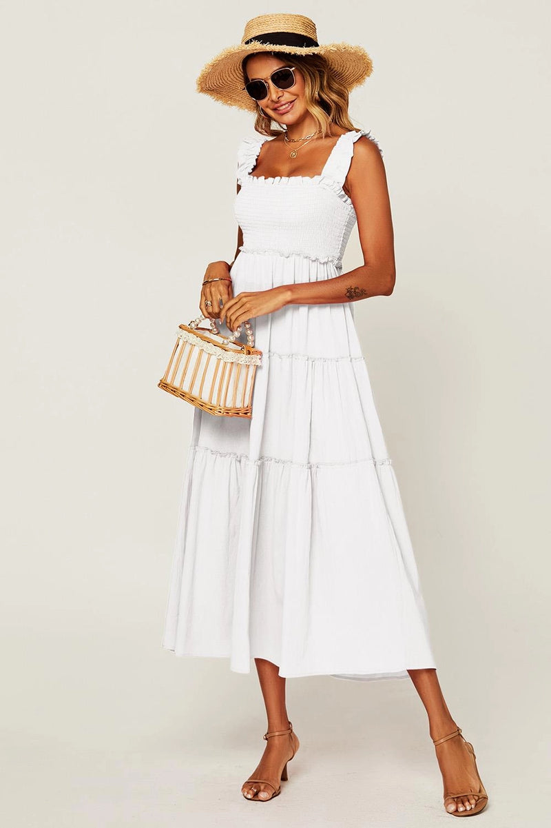 FS Collection Tiered Wide Strap White Shirred Beach Sun Dress