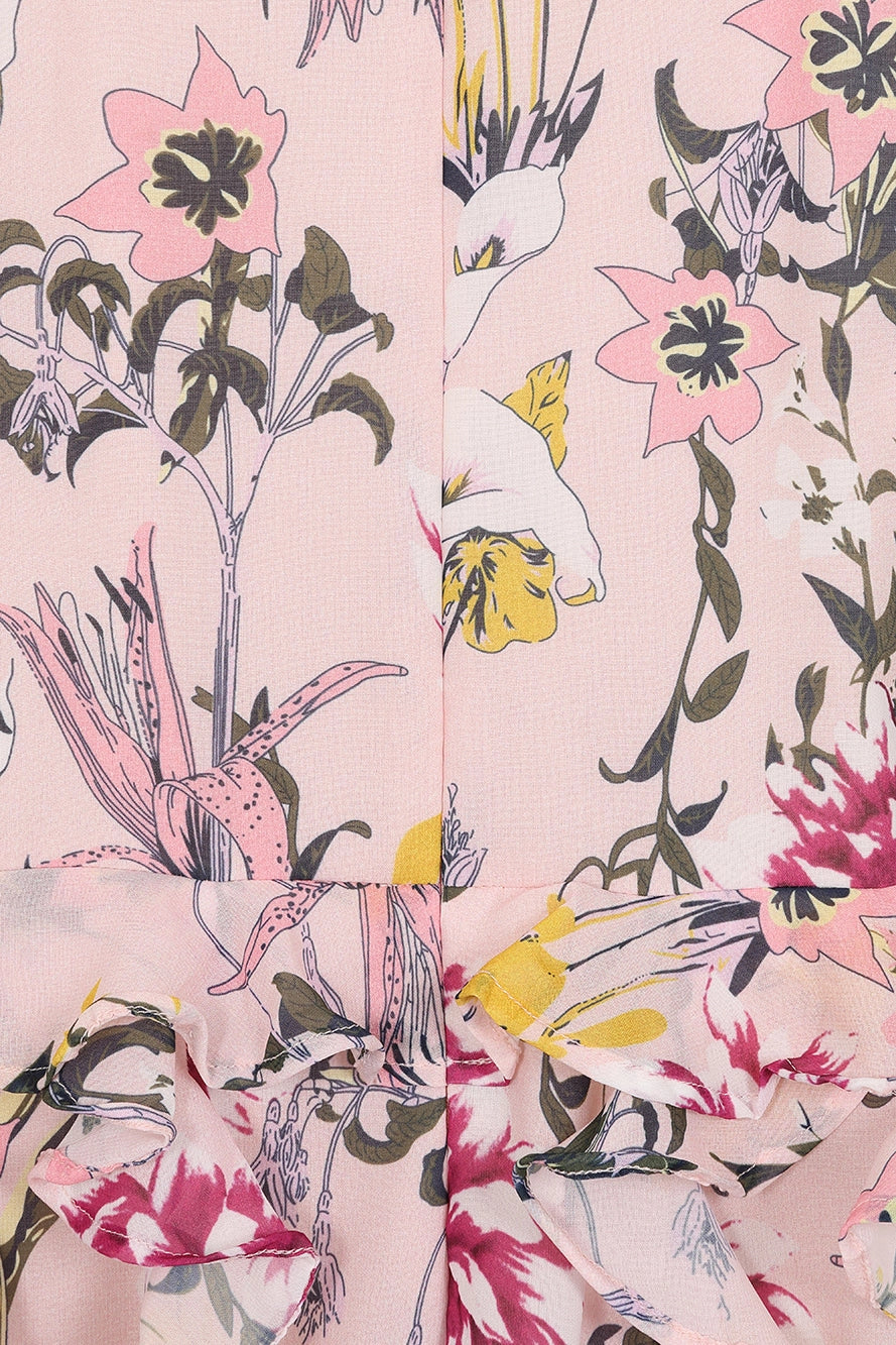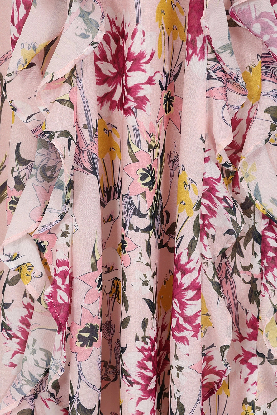 Crafted in a charming pink floral print, this feminine style is complete with ruffled detail that flows through the voluminous midi length skirt.