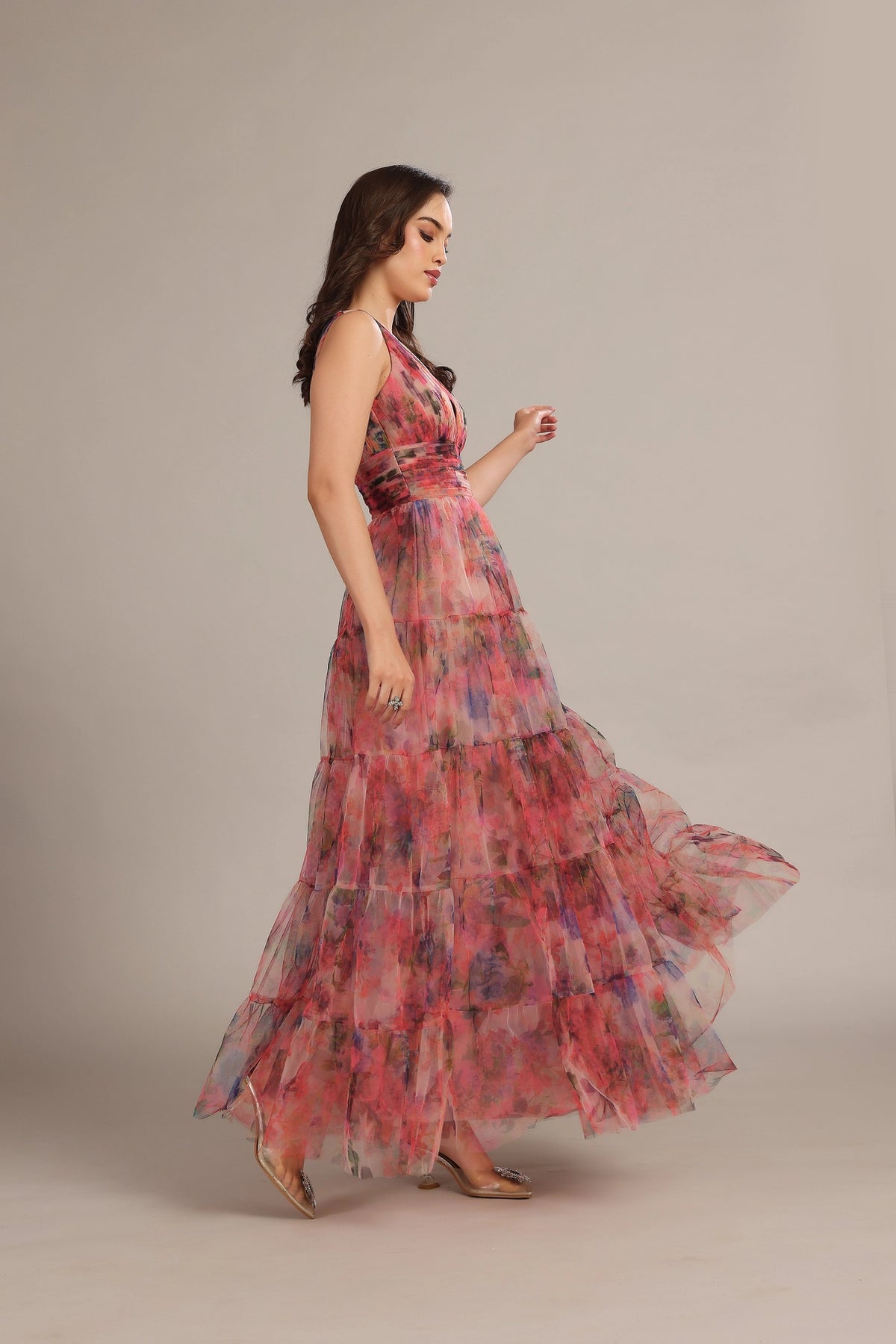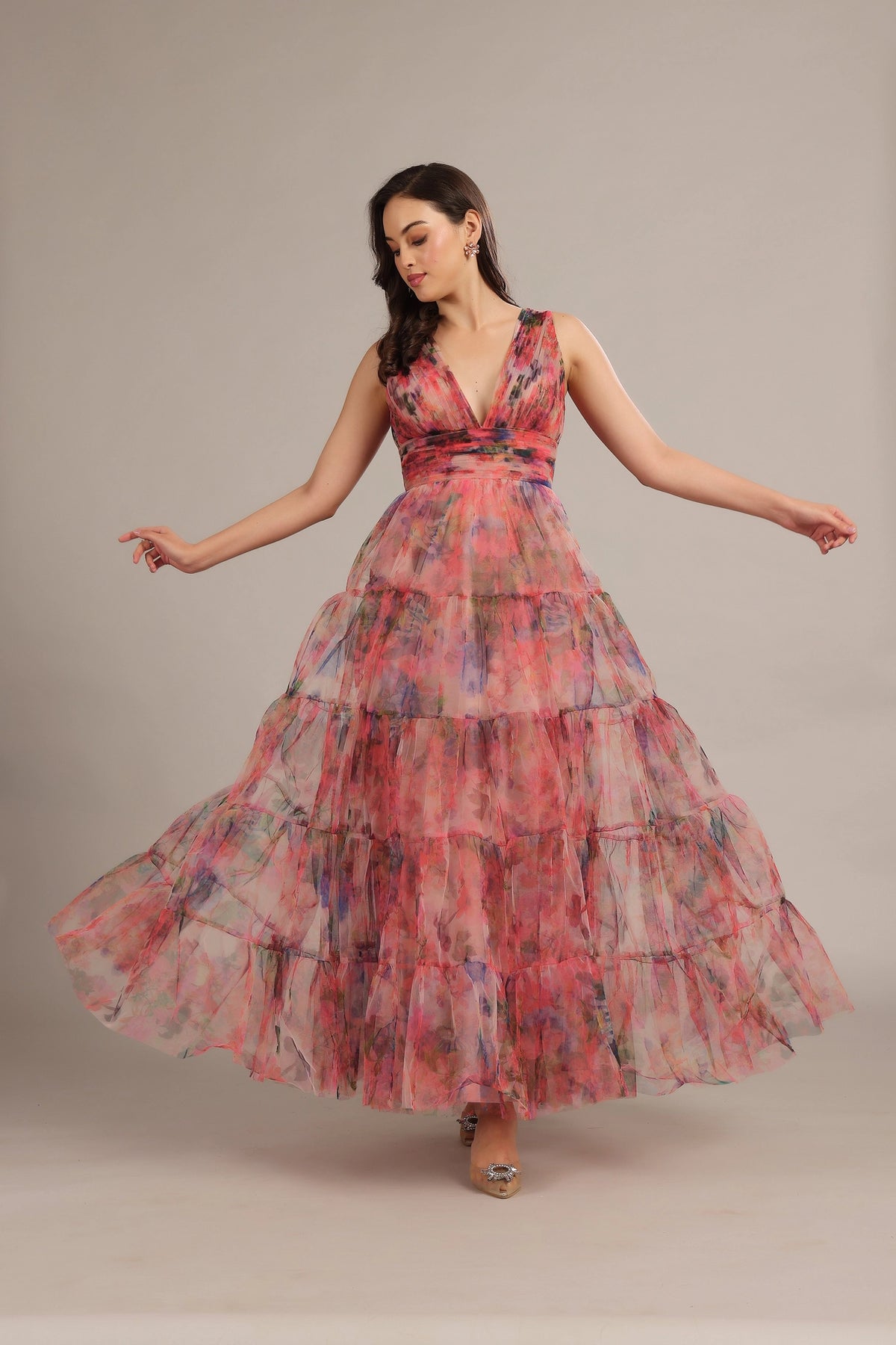 This style is a floaty favourite and one of our best-selling prints for a reason. With its flattering deep V-neckline, fitted waistband, and soft tulle layers, this dress is both easy to wear and effortlessly eye-catching.