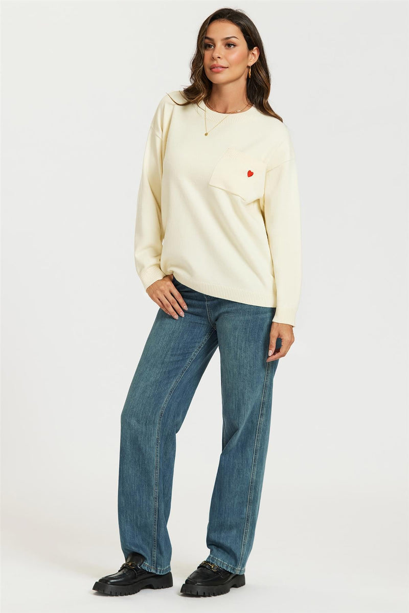 FS Collection Heart Embroidered Knit Jumper Top In Cream