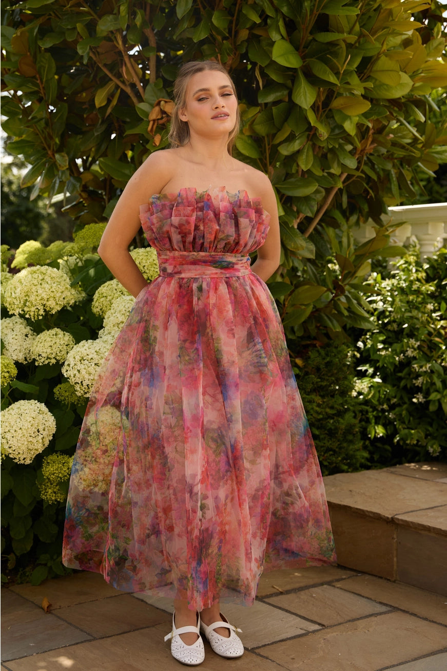 Lace & Beads Nusrat Tulle Bandeau Pink Floral Midi Dress