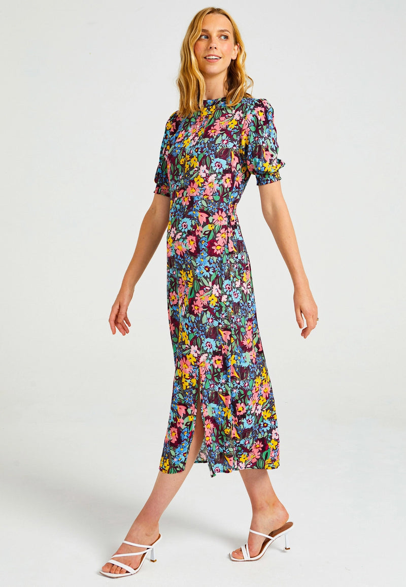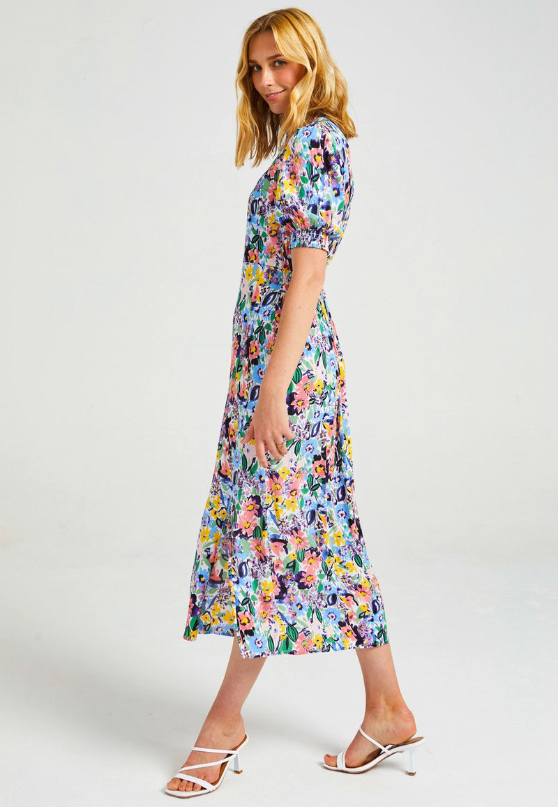 Angeleye Short Sleeve Floral Midi Blue Dress