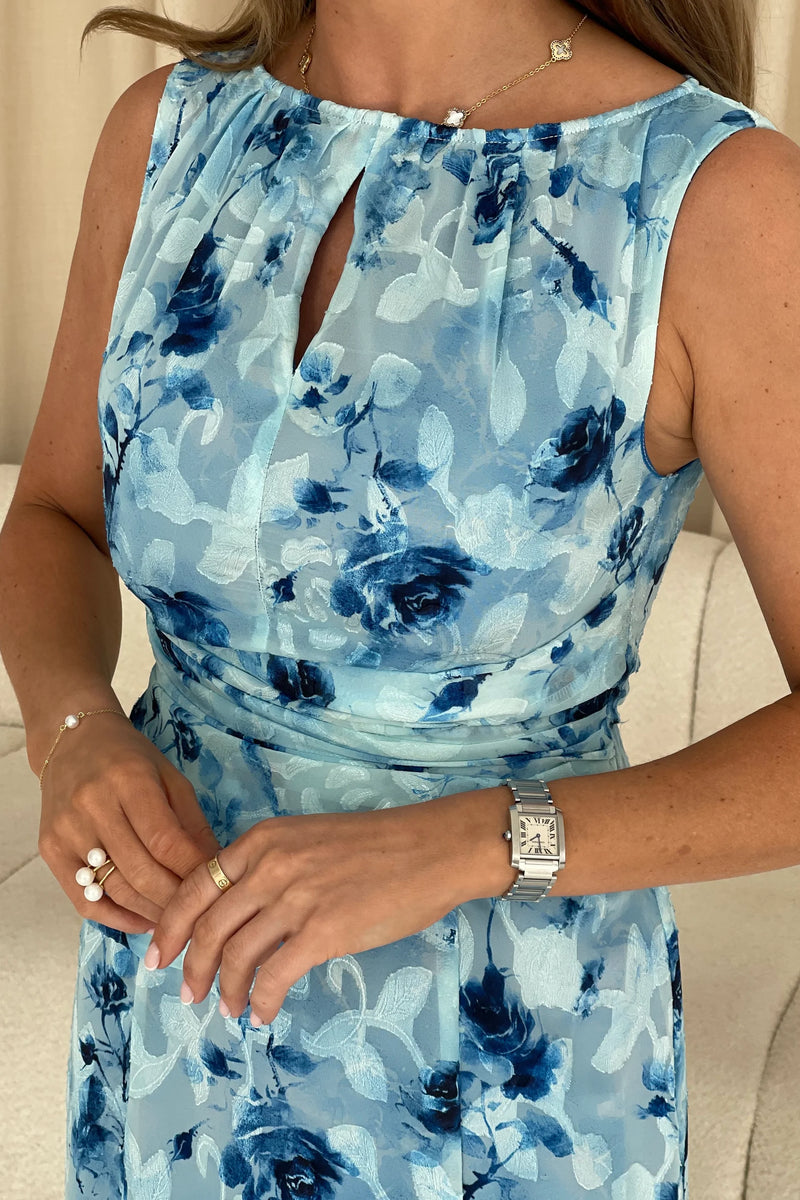 Girl In Mind Erica Square Neck Pleated Blue Floral Midi Dress
