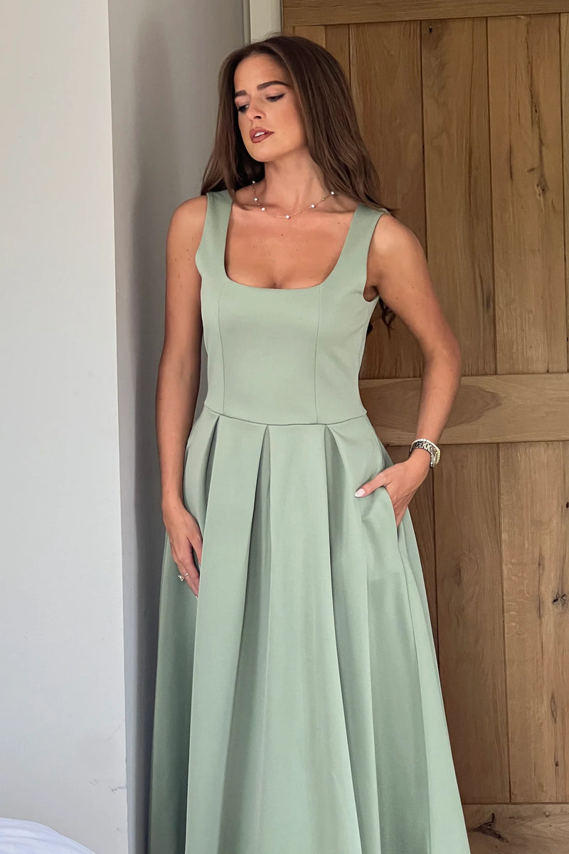 Girl In Mind Erica Square Neck Pleated Sage Midi Dress