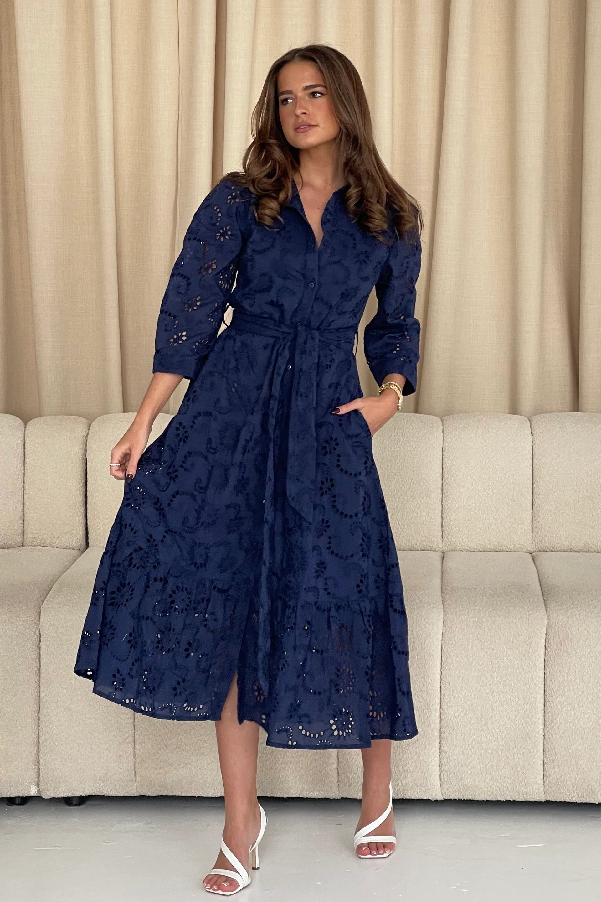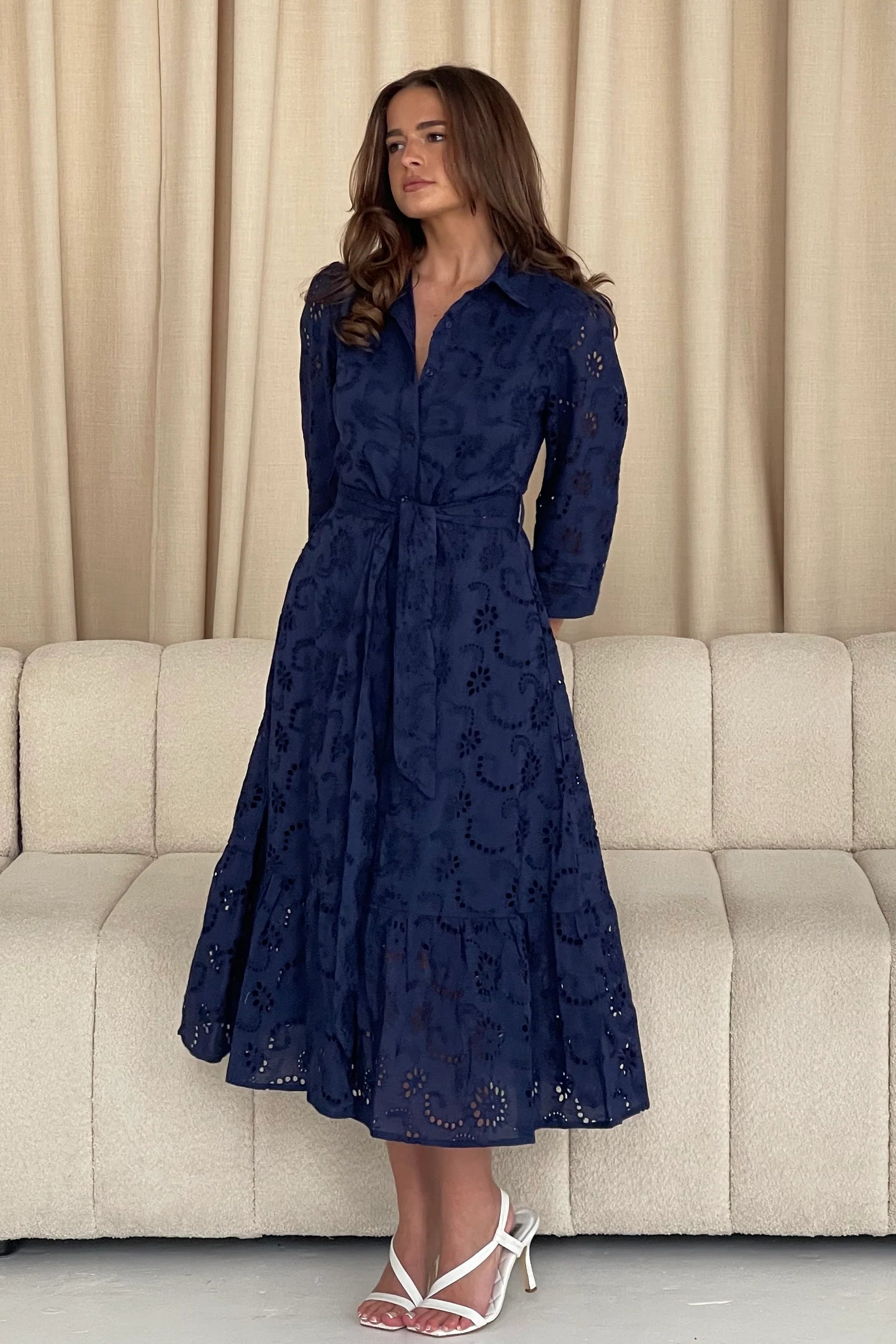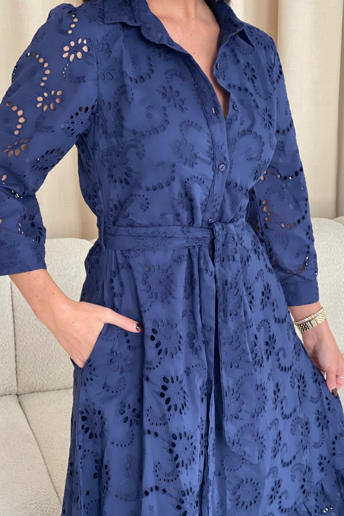 The Michelle Navy Blue Broderie Anglaise Shirt Midaxi Dress from GIRL IN MIND is a must-have in your wardrobe! Featuring button front detailing, Cotton broidery fabric and even pockets! It is truly a perfect dress.