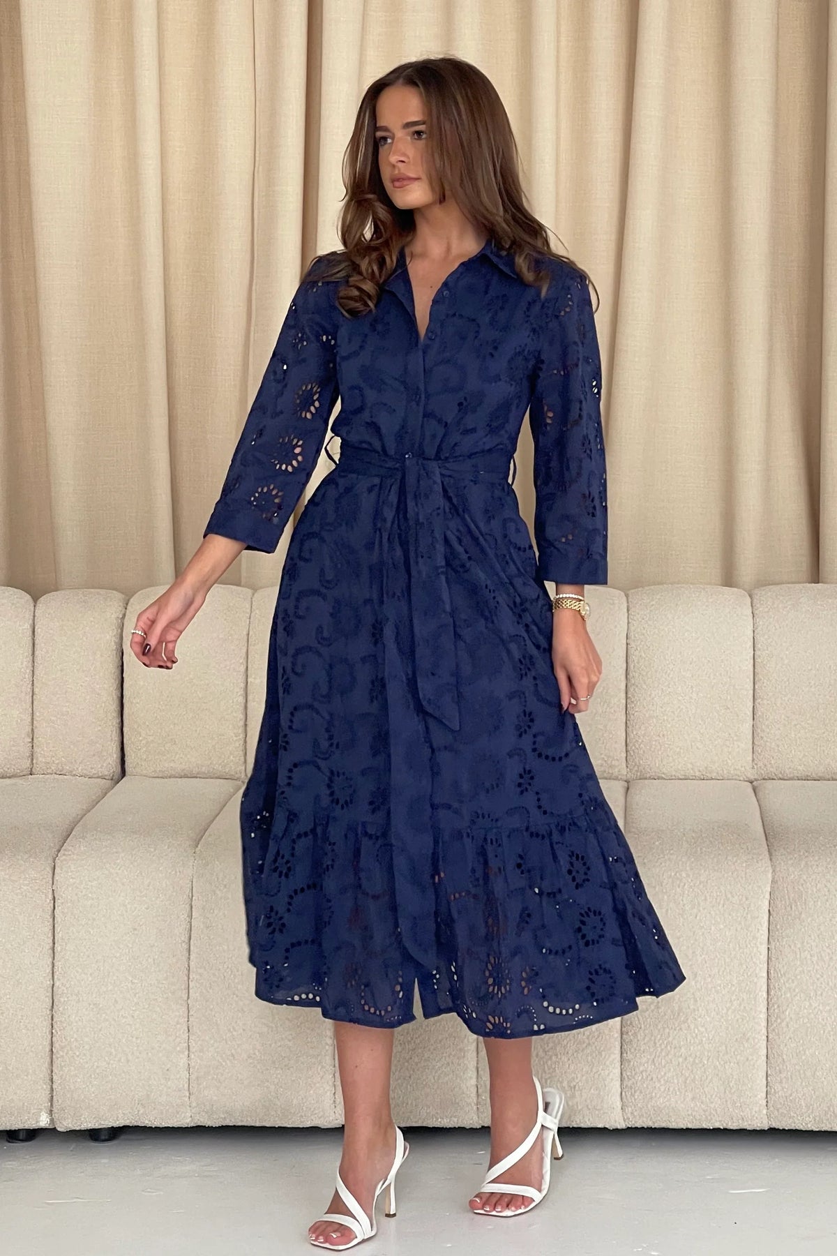 Girl In Mind Michelle Broderie Anglaise Midaxi Navy Blue Dress