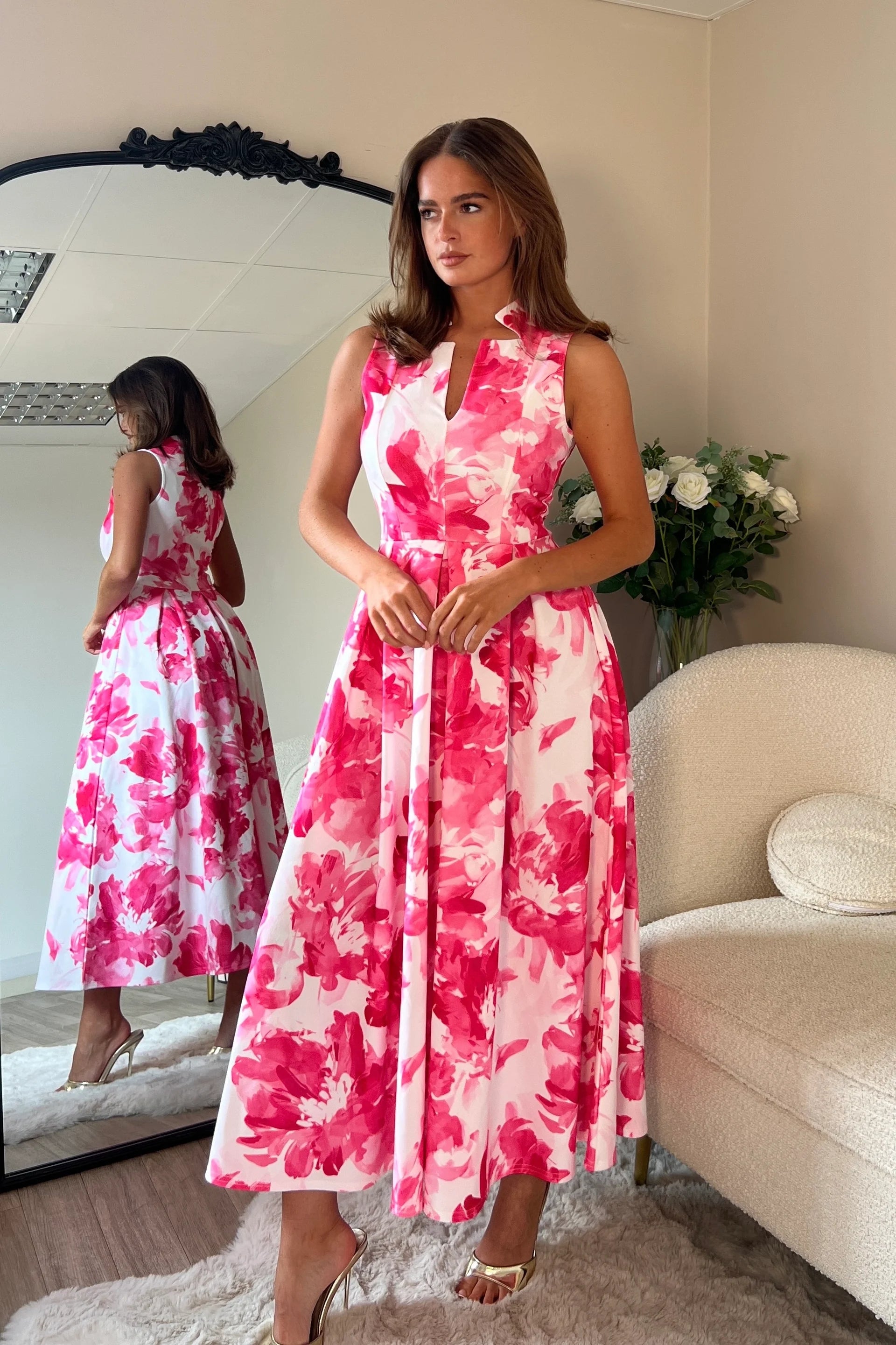 Indulge in the sophistication and elegance of the Ameya Notch Neck Sleeveless Midi Dress in Pink Floral from GIRL IN MIND. Featuring a unique buckle detail and flattering skater skirt, this dress exudes femininity and style. The notch neck adds a touch of exclusivity to this must-have piece. Elevate your wardrobe with this luxurious dress.